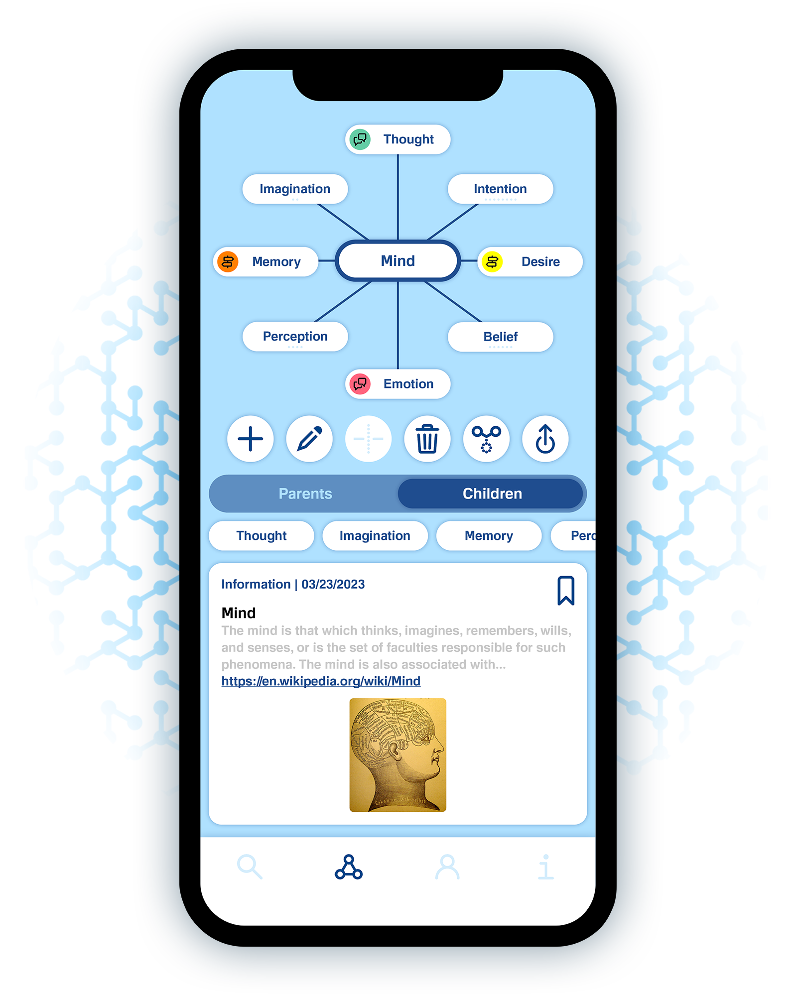 Engage in dynamic conversations with an Artificial Intelligence to explore, refine, and expand your personal knowledge. AI-generated insights seamlessly integrate into your structured Mind Maps, enabling continuous learning and self-improvement.