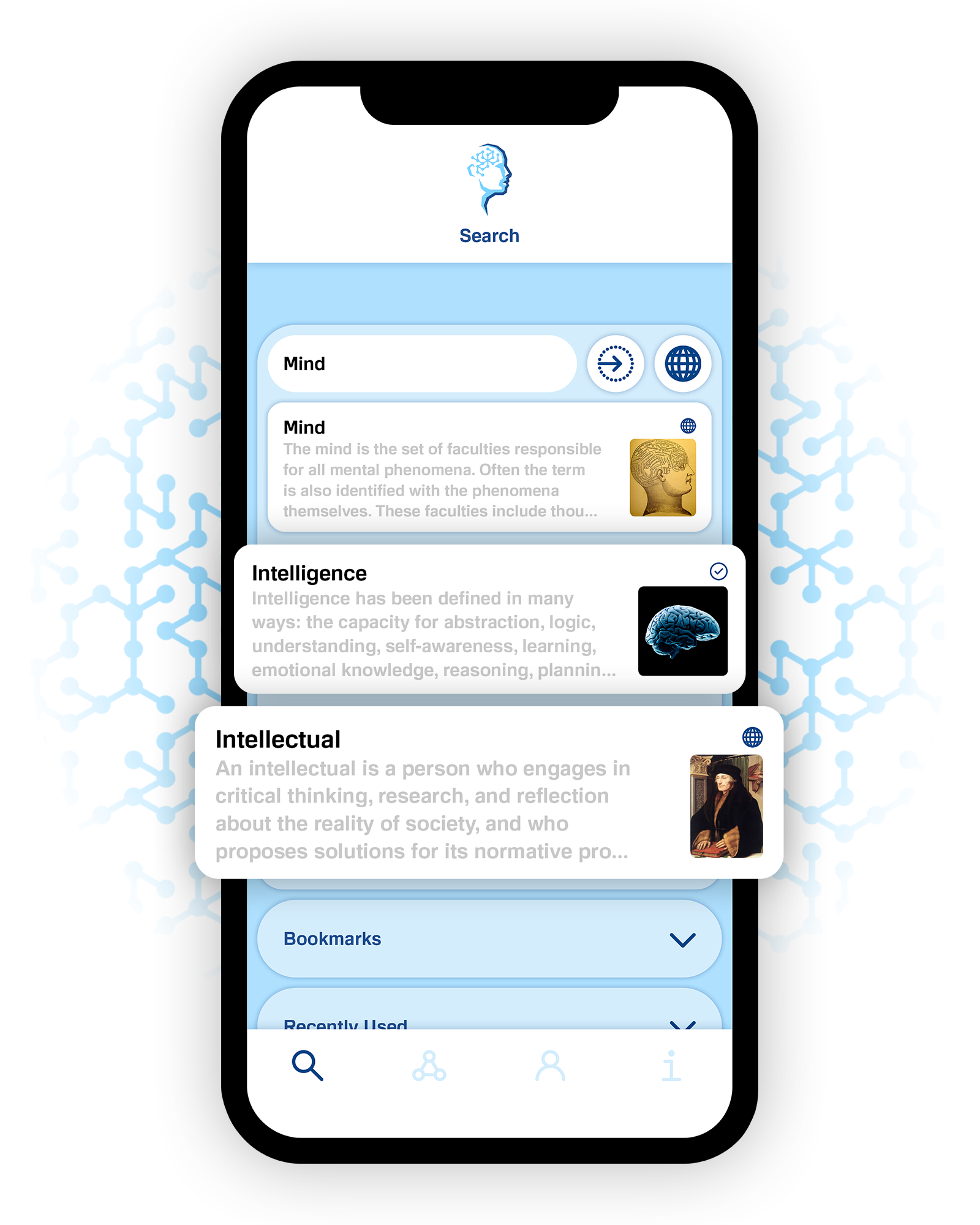 - Either find terms with mindlib's integrated text-search or navigate through the network - or combine both: The power of relations lets you find anything, even if you can only recall an information's context.